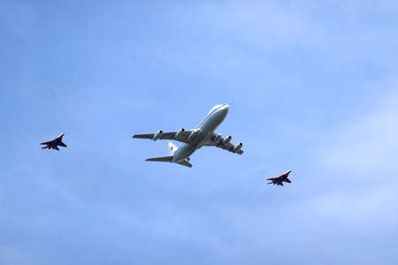 MOSCOW, RUSSIA - MAY 7, 2022: Doomsday plane Il-80 (Maxdome) escorted by two fighter jets flies over Moscow at a parade rehearsal in blue sky