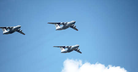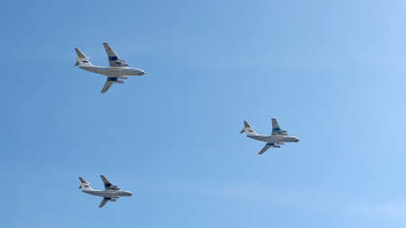 MOSCOW, RUSSIA - MAY 7, 2021: Avia parade in Moscow. 3 Ilyushin Il-76 multi-purpose four-engined strategic airlifters fly in the sky on parade of Victory in World War II in Moscow, Russia