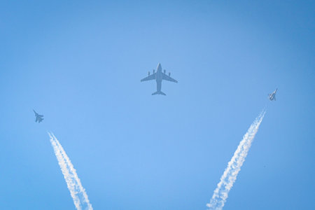 Gijon, Spain - May, 24, 2024: A large cargo plane flies high in the sky, accompanied by two smaller fighters. Silhouettes of airplanes loom against the clear blue sky