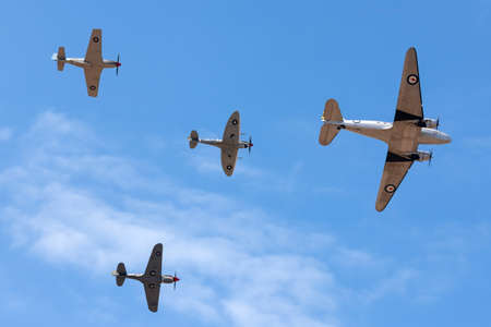 RAAF Williams, Point Cook, Australia - March 2, 2014: Former Royal Australian Air Force (RAAF) Douglas C-47B (DC-3) leading a formation of World war II fighter aircraft including a Spitfire, P-51 Mustang and Curtiss P-40.