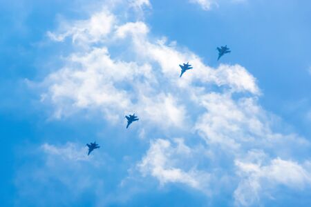 28.04.2020 Russia Rostov-on-don A group of professional pilots of military aircraft shows tricks in the sky. Rehearsal of victory day parade in Russia. In sunny spring summer, clouds float on the blue sky. good cloud weather.