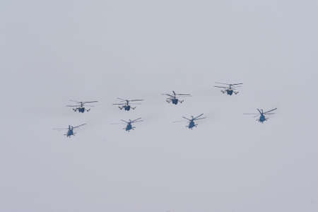 MOSCOW, RUSSIA - MAY 9: Ansat-U light multipurpose helicopters fly on military parade devoted to 70th anniversary of Victory Day in WWII in Europe aka The Great Patriotic War.