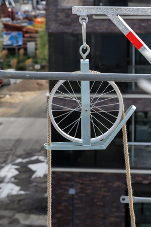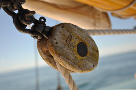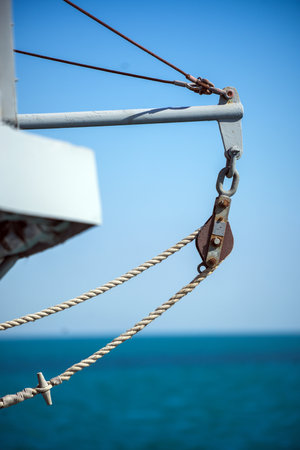 Closeup view of ship rope tackles on outdoors sunny blue sky background