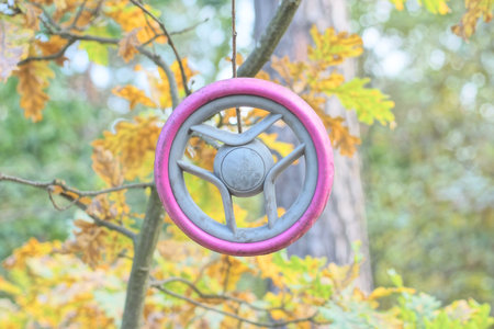 one old gray pink plastic wheel from a wheelbarrow hanging on a tree branch on a summer street