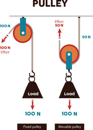 Pulley vector illustration. Labeled mechanical physics explanation scheme.