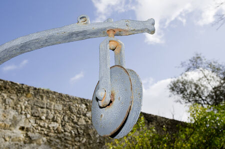 Outdoor shot of a rusty pulley in a pier of Barcelona port.