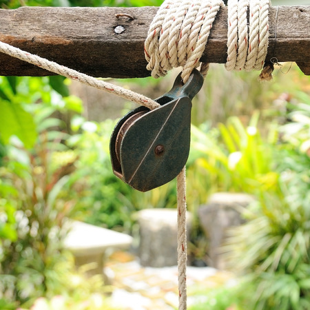Old wooden pulley block at sunset, color toning applied, selective focus.