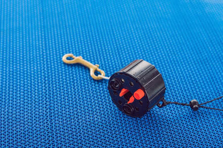 Strong magnet on a red rope carabiner, on a wooden surface. Equipment for magnet fishing