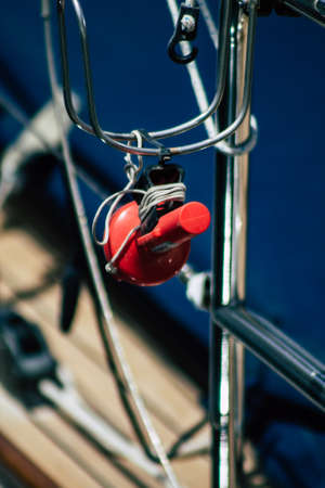 Close up of a red rope and a sail knot on a sailboat in Riviera of Athens in Grece