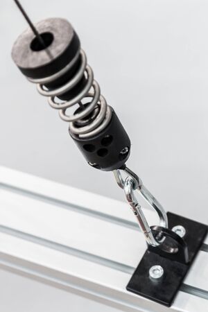Ukraine, Migea - July 30, 2017: Close-up Automatic brake unit Head Rush Zip Stop for high-speed lines Zipline and for trolley lines. Equipment for safe trolling on a steel cable. Zipline.