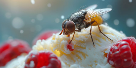 A macro close up of a vanilla ice cream with a large fly sitting on top, surrounded by raspberries on a blue background, illustrating the unhygienic aspect of insects on food. High quality photo