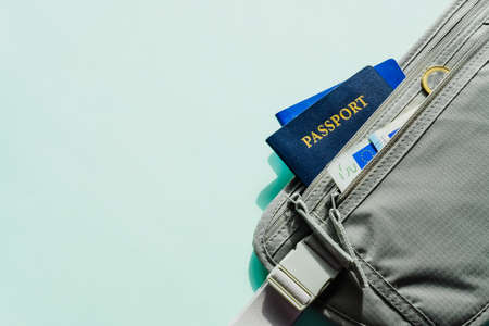 Travel concept. Passports, organizer belt wallet and money flat lay on mint green background.