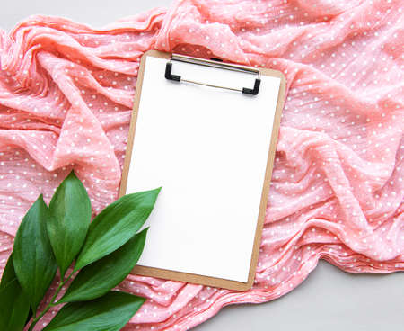 mock up clipboard and green leaves and pink scarf on white background top view. copy space. flat lay