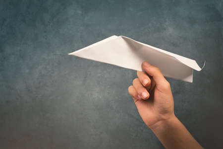 Holding a aper airplane in the handon a textured background, empty copy space for text