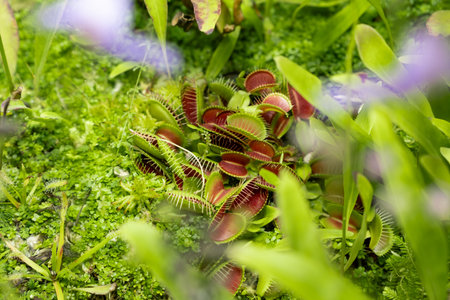 Venus flytrap in garden bed. Dionaea muscipula. Exotic tropical plant. Beauty in nature.