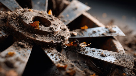 A striking close-up of an abandoned metal fan blade, layered with dust and surrounded by fallen leaves, illuminated by soft natural light, highlighting decay.