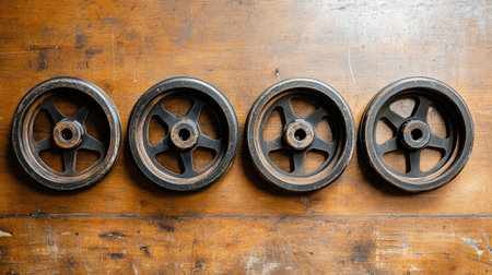A collection of four vintage industrial wheels resting on a wooden surface. These wheels showcase a weathered texture, ideal for backgrounds in creative projects or design concepts.