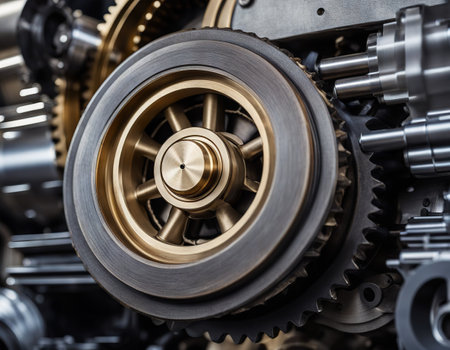 Industrial metal mechanism displaying intricate gears and fasteners, illustrating precision engineering and robust construction for heavy duty machinery and technology
