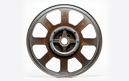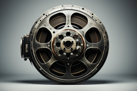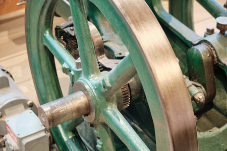 A close-up of the flywheel of an industrial steam engine