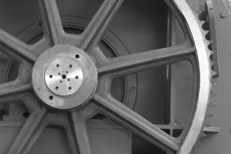 Detail of antique elevator metal gear wheel black and white.
