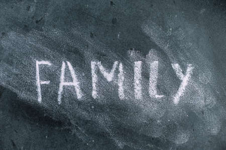 The semi-erased word FAMILY on the black chalkboard. handwritten word. Fuzzy letters on black surface.