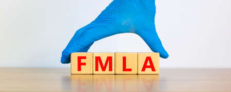 FMLA, family medical leave act symbol. Concept words 'FMLA, family medical leave act' on cubes on a beautiful white background. Doctor hand in blue glove. Copy space. Medical, FMLA concept.
