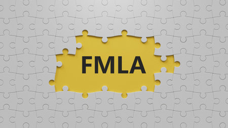 FMLA word written on The white puzzle pieces with missing pieces with copy space.close up of The white puzzle pieces with missing pieces,Business Concept.3D rendering on green background.