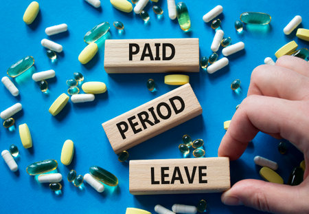 Paid Period Leave symbol. Concept words Paid Period Leave on wooden blocks. Beautiful blue background with pills. Doctor hand. Healthcare and Paid Period Leave concept. Copy space.