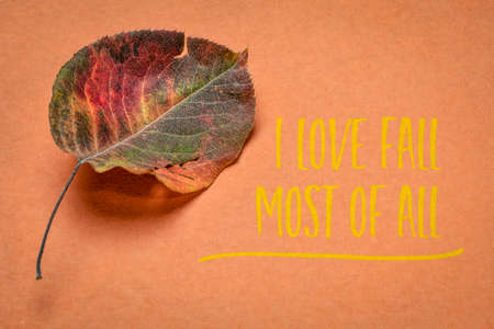 I love fall most of all - handwriting on handmade rag paper with a dried leaf from Asian pear tree, season concept
