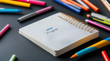 A close-up of an open notebook with '2024 Vision' written at the top, surrounded by colorful pens