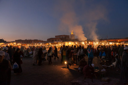 Bustling evening market in marrakech with crowd under blue sky