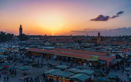 The famous Jamaa el Fna square in Marrakech, Morocco. Jemaa el-Fnaa, Djema el-Fna or Djemaa el-Fnaa is a famous square and market place in Marrakesh's medina quarter. Colorful sunset.