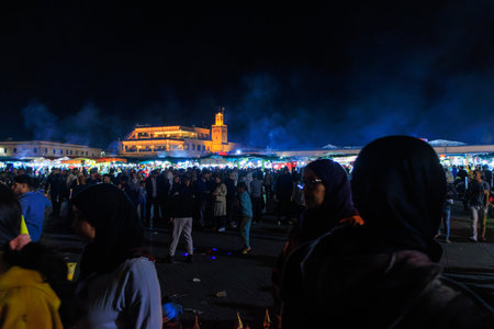 Marrakech, Morocco - May 11 2019: Jema Eel-fna Square seen at night, full of life and activities, tourists, merchants, restaurants, stalls.