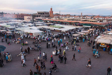 Marrakech, Morocco - March 27, 2018: Panoramic high angle dusk view over Jemaa El-Fna square at evening in historic old town medina
