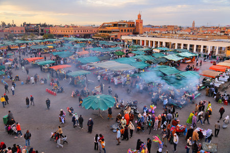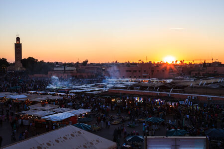 MARRAKESH, MOROCCO - MAY 25, 2014: Sunset over Jamaa el Fna (also Jemaa el-Fnaa, Djema el-Fna or Djemaa el-Fnaa) square and market place in medina quarter. During the night it´s full of food-stalls