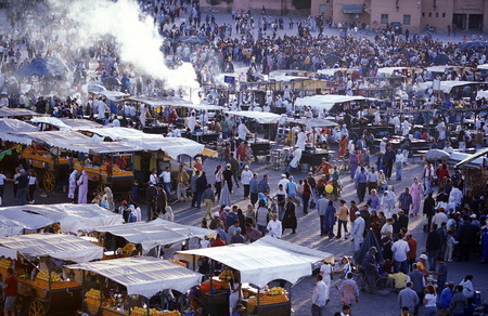 Marrakech, Morocco - March 23, 2006: A crowd of local people and tourists in the famous Jemaa el Fna square.