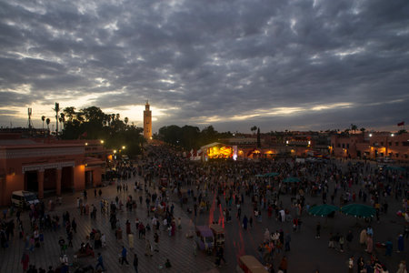 MARRAKESH, MOROCCO - JUNE 03, 2017: Evening in the famous Jemaa el-Fnaa square (also Jemaa el-Fna, Djema el-Fna, or Djemaa el-Fnaa). It is a square and marketplace in the medina, popular by tourists.