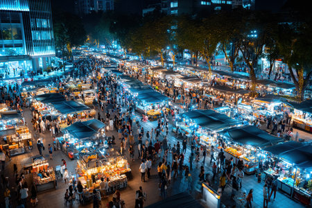 Elevated view of a bustling night market with numerous vendors and shoppers