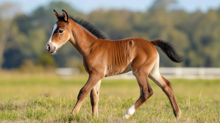 Portrait of a bay foal with a stripe in the paddock on a sunny day