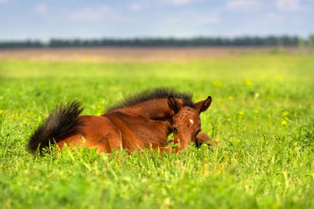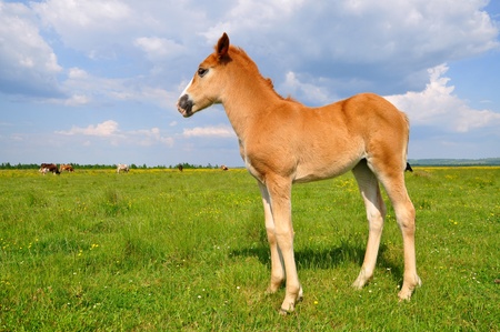 The picture shows a small foal,a field,grass,sky.Foal grazing in the meadow.