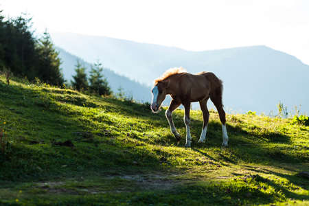 A foal walks on the pasture in the mountains, Ukrainian Carpathians