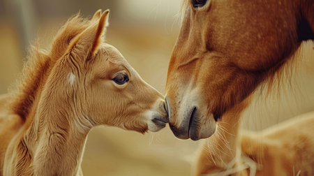 A mother horse affectionately nuzzles her foal in a green pasture, surrounded by tall grass and trees, with a rustic barn in the background on a bright day.