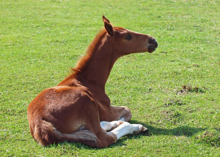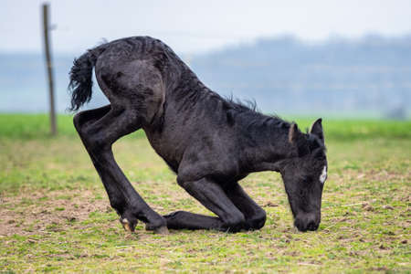 A pretty foal stands in a Summer paddock, Foal playing in a meadow
