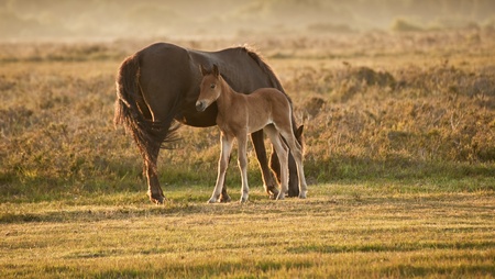 Mare and foal of New Forest pony grazing in landscape lit by warm sunrise