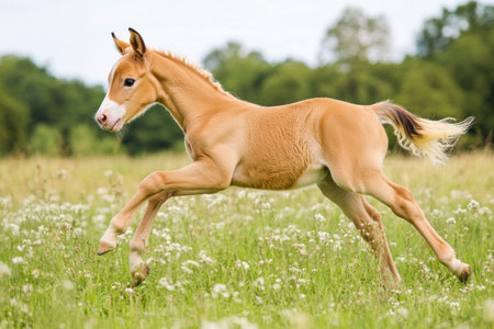 A young foal stands in a field filled with bright yellow flowers, showcasing its playful stance.
