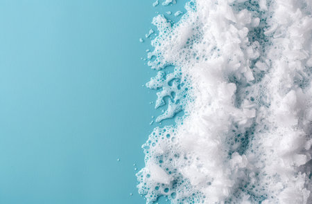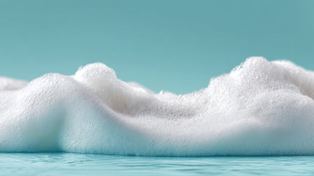 This image captures the delicate beauty of white soap foam resting on an aqua surface, showcasing the soft textures and intricate patterns, perfect for wellness themes.