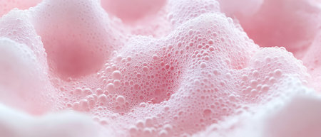 Close-up of translucent bubbles and soft foam in pink hues, creating a dreamy and vibrant abstract texture on a bright background.
