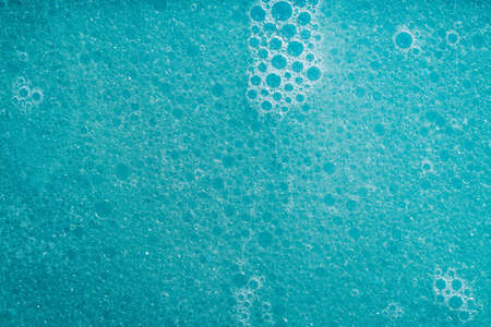 Soap foam against the turquoise background. Bubbles of washing foam and white dots on the colored surface. Shampoo foam texture. selective focus.