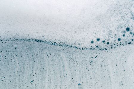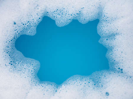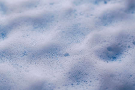 White and blue soap foam. Lather with many small bubbles. Laundry cleaning or sea wave background.