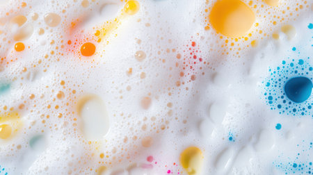 An abstract close-up of colorful bubbles in foam creates a vibrant and playful visual. The intricate patterns and shiny textures evoke a sense of freshness and cleanliness.